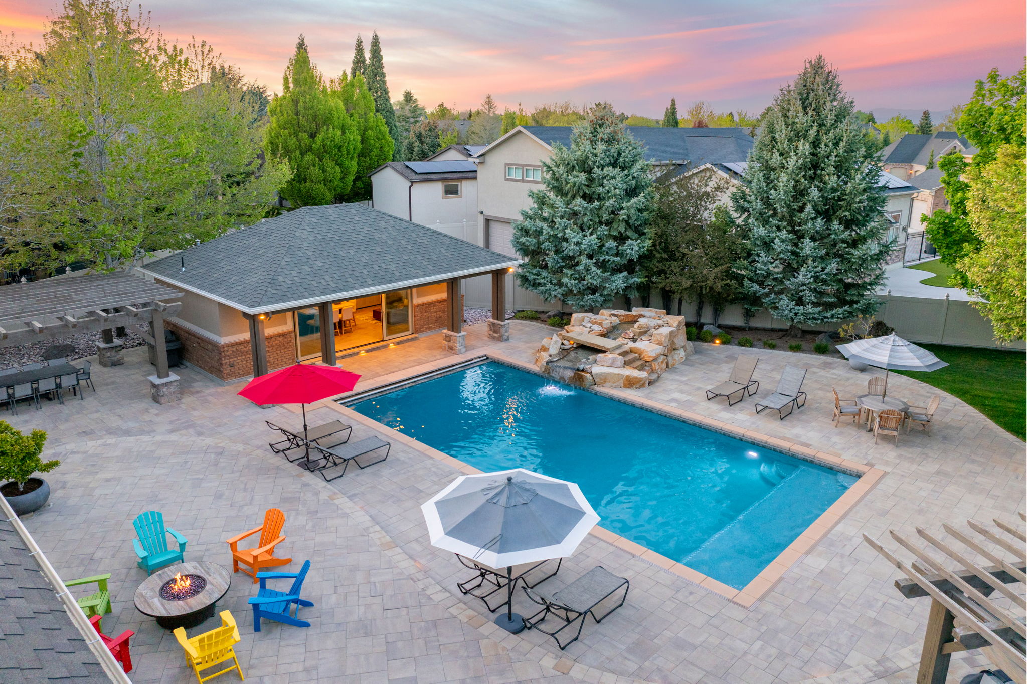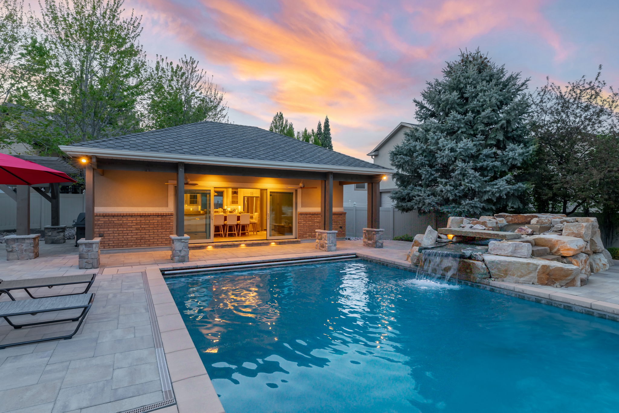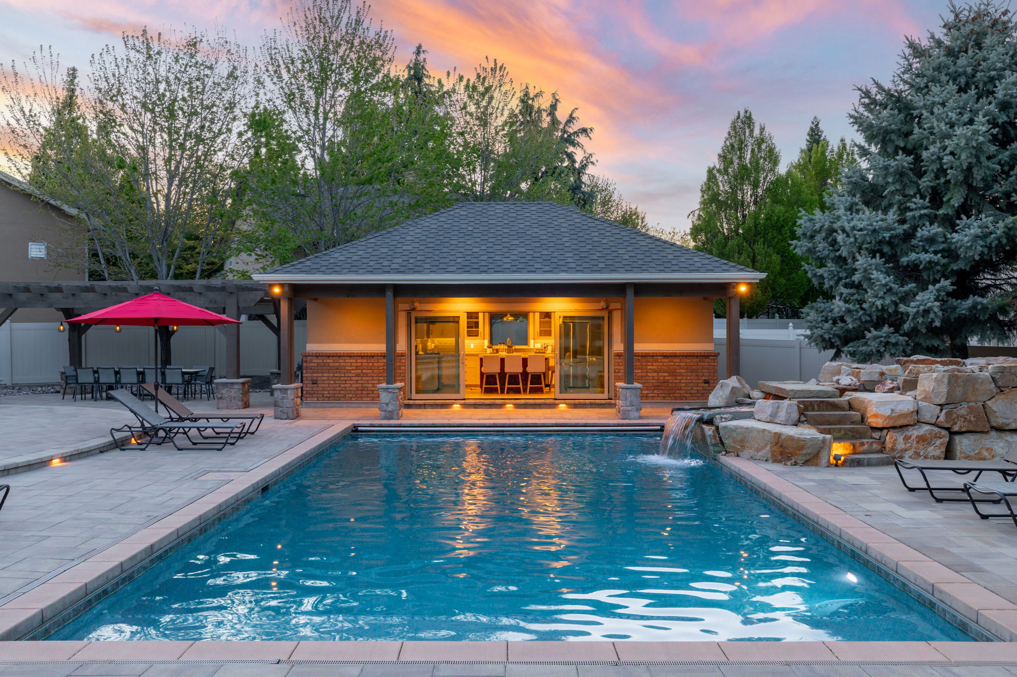 Enhancing the experience even further is a separate pool house designed as the ultimate guest retreat, complete with a full kitchen, bathroom, and a thoughtfully integrated Murphy bed. Whether hosting overnight guests or creating a private escape, this space offers a level of comfort and versatility that rivals a luxury suite—one your guests will never want to leave.