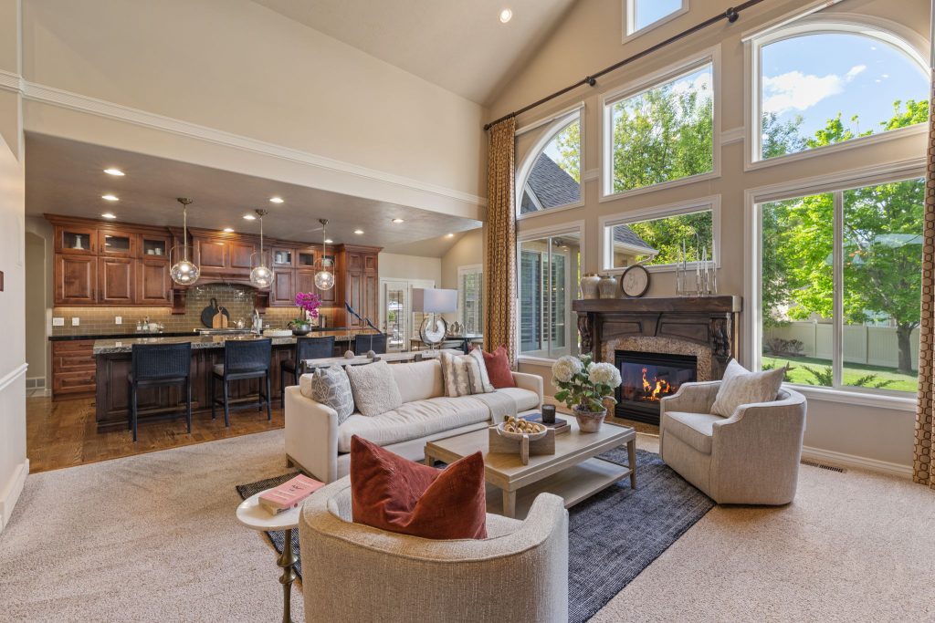 Inside, the home unfolds with soaring ceilings and abundant natural light, creating an atmosphere that feels both grand and welcoming. With over 6,000 square feet, the layout offers a seamless balance of everyday comfort and elevated entertaining. Expansive living spaces, refined finishes, and a sense of architectural intention are felt throughout.